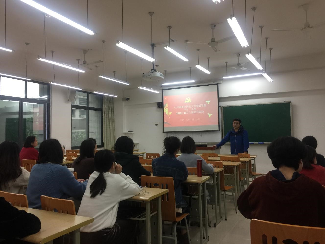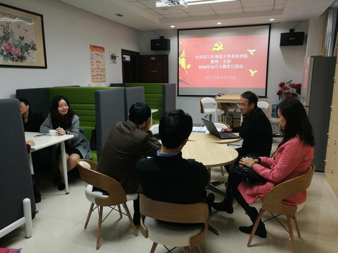 2018年10月19日,英语学院两个教师党支部和四个学生党支部分别召开了支部主题党日学习活动,学习了《习近平新时代中国特色社会主义思想三十讲》和《中国共产党党内监督条例》。