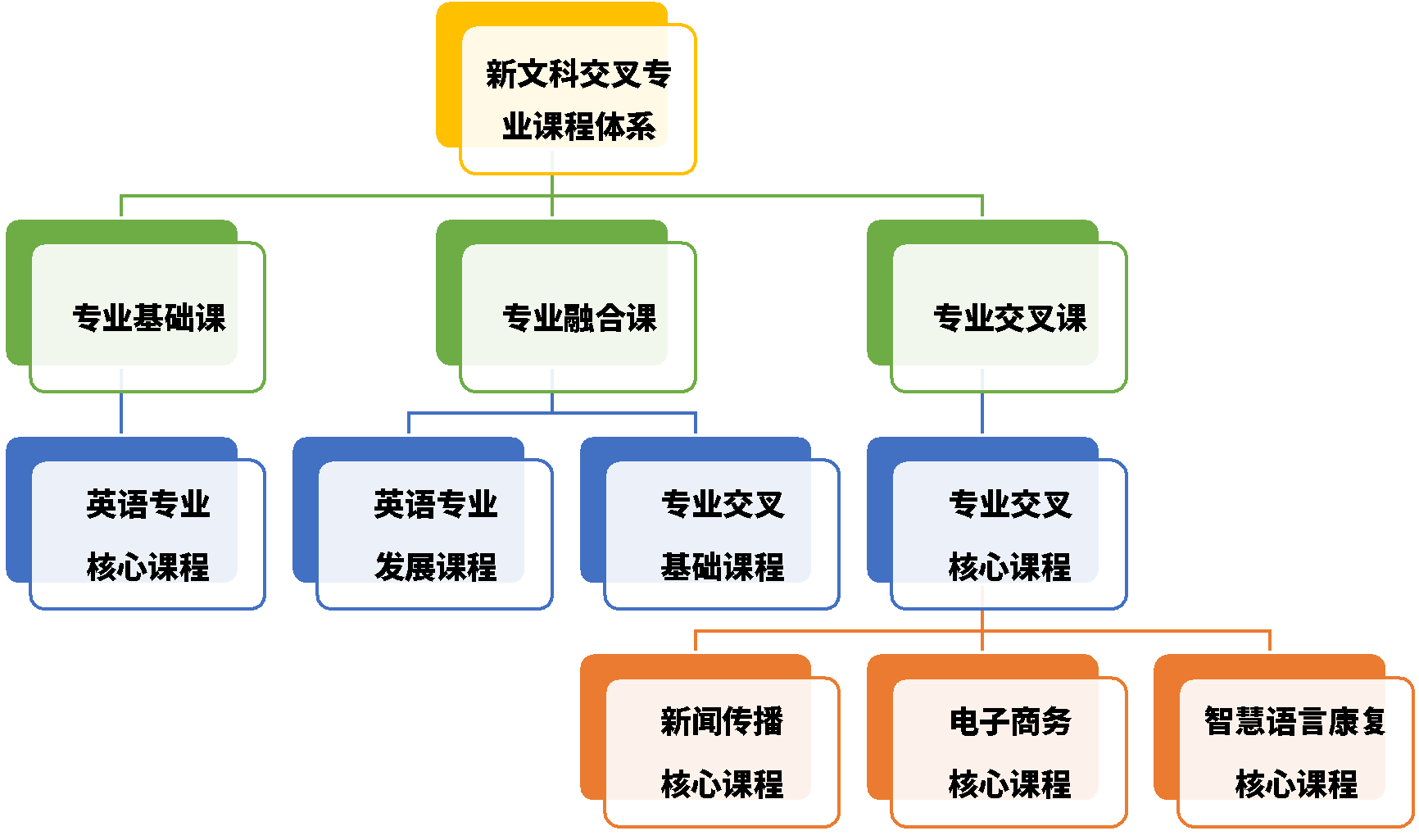 学院新文科交叉专业课程设置充分结合了英语专业的属性和交叉专业的特色,由“专业基础课”“专业融合课”和“专业交叉课”三大板块构成。专业基础课旨在通过第一、二学年的英语专业基础知识学习和基本技能训练,夯实学生英语运用基本能力。专业融合课涵盖英语专业素质发展课程和交叉专业入门课程,帮助学生在进一步提升英语专业能力的同时,奠定交叉专业知识学习的基础。专业交叉课程由跨专业领域的主干课程组成,旨在帮助学生掌握相关专业的核心知识。