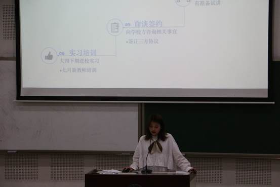 最后,将要于重庆八中担任英语教师的潘荣荣学姐介绍了她在中学教师一职面试中的实践经验。潘荣荣强调,在前期准备过程中,应着重个人的简历充实。而进入考核阶段后,同学应注重锻炼个人专业能力、授课姿态与思维敏捷度。