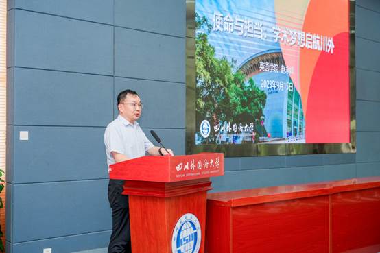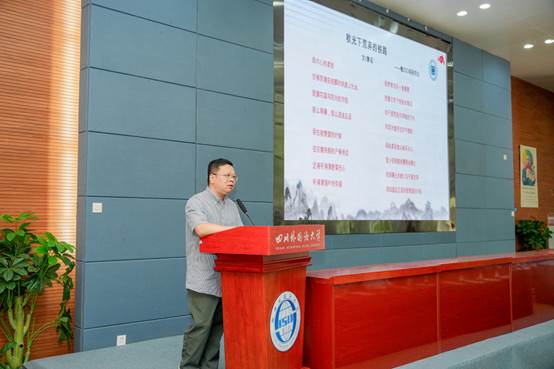 英语学院党总支书记淡修安教授赠予同学们三条人生锦囊:一是注意意识形态安全:正能量做人;二是注意情感安全:与人自由,于己自在;三是注意财产安全:严防死守,预防诈骗。而后,他以自己创作的《秋光下的铁路》表达对川外的深厚感情,并鼓励同学们在新的道路上奋勇前进。